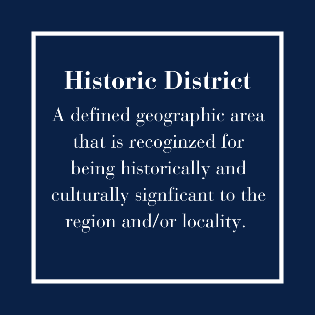 - Historic District: a defined geographic area that is recognized for being historically and culturally significant to the region. Properties within this district can be (depending on locality and jurisdiction) subject to guidelines for preserving historic structures.