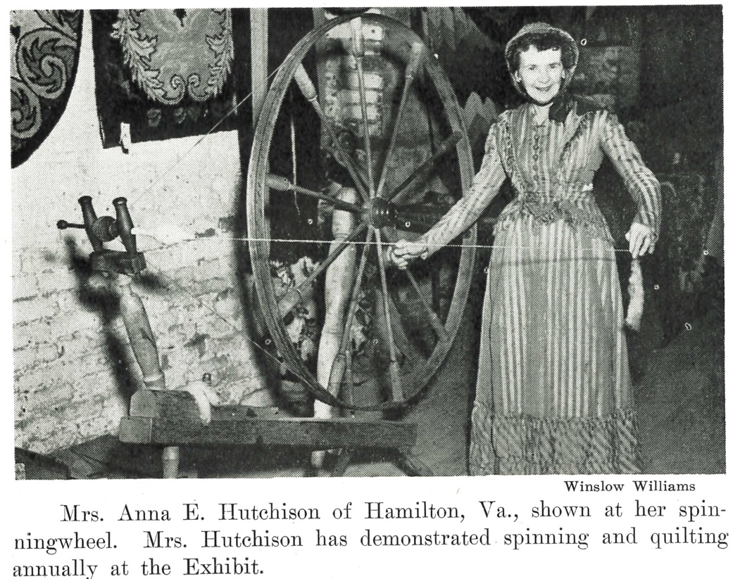 Mrs. Dodd’s parents were Douglas and Winifrede “Freda” Myers, two of the thirteen founding directors of the Waterford Foundation in 1943. The first exhibit was held in October 1944, entirely housed in the Fairfax Meetinghouse on Loyalty Road. Following the success of the first exhibit, in subsequent years the event expanded to other locations in the village to feature additional artisans and demonstrations, including the school auditorium and several private homes. Local artists participated as demonstrating artists, such as Anna Hutchison from nearby Hamilton, who demonstrated spinning for several years.