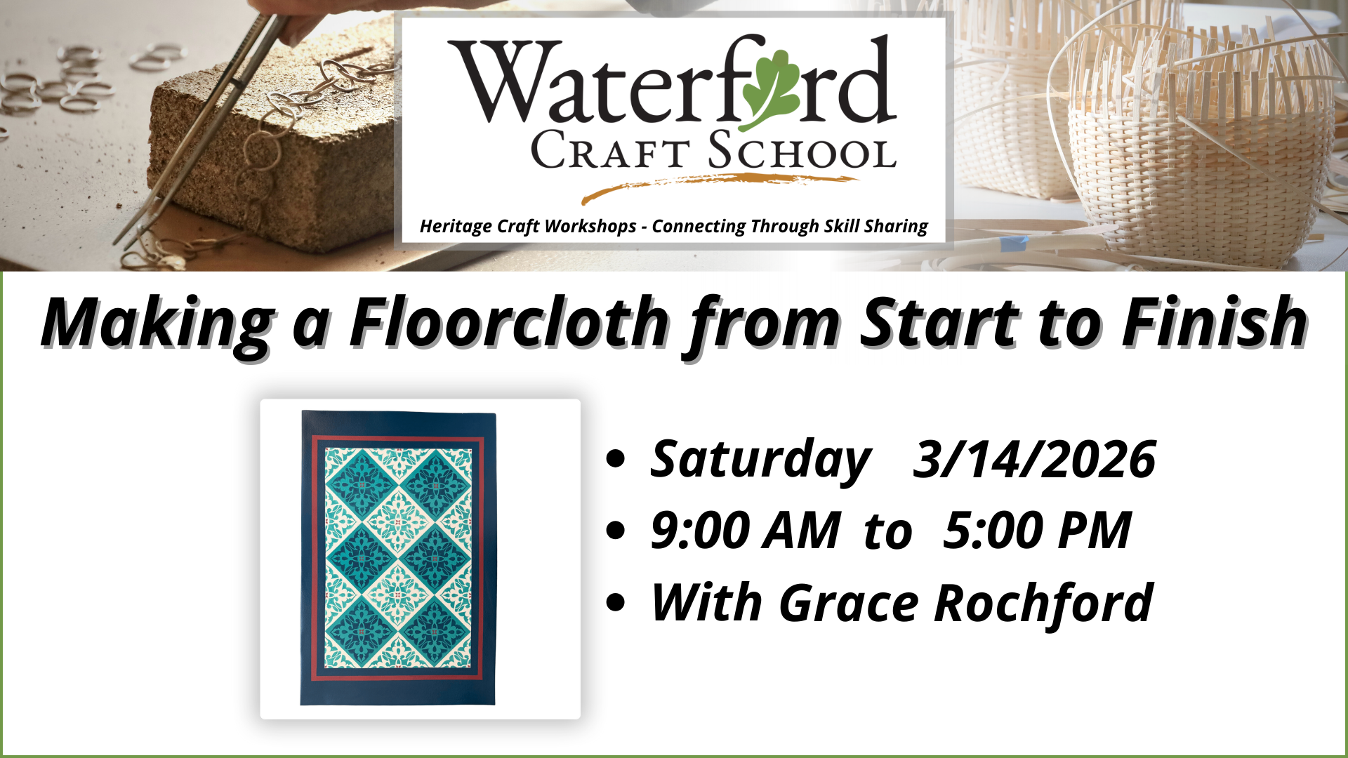 Create your own beautiful 2’ x 3’ painted canvas floorcloth in this one-day workshop! Popular in the 18th and 19th centuries as a durable and decorative floor covering, floorcloths are both practical and beautiful. Choose a diamond pattern, pick your colors, and bring your vision to life using provided paints and stencils—or your own designs. All materials are included